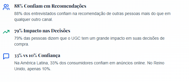 Os números falam por si. Na América Latina, apenas 33% dos consumidores confiam em anúncios online, como banners . No Reino Unido, esse número cai para apenas 10% quando se trata de anúncios em redes sociais. Por outro lado, 88% dos entrevistados confiam na recomendação de outras pessoas mais do que em qualquer outro canal . Além disso, um estudo da Stackla apontou que 79% das pessoas dizem que o UGC tem um grande impacto em suas decisões de compra .