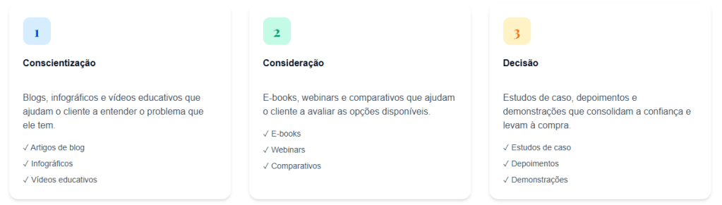 Conteúdo Ideal: E-books, webinars, guias comparativos, estudos de caso e avaliações de produtos.