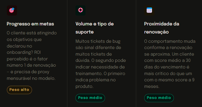 A pergunta que orienta a construção de qualquer modelo sólido é simples: o que os clientes que cancelaram nos últimos 12 meses tinham em comum, 60 dias antes de sair? Se você consegue responder essa pergunta com dados, você tem os ingredientes do seu health score. Se não consegue, você vai construir um modelo baseado em intuição – e intuição não escala.