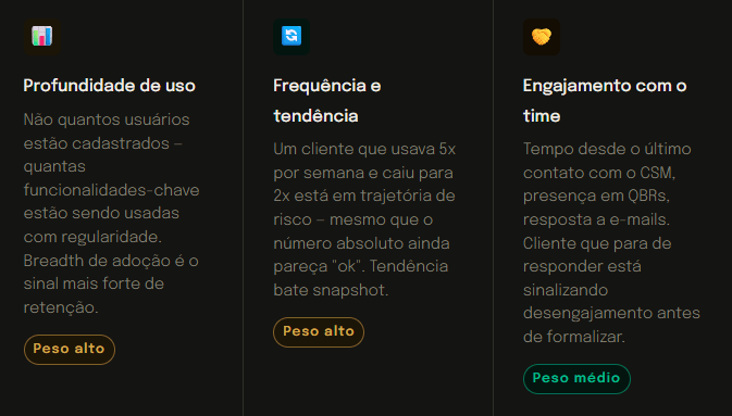 Não existe um conjunto universal de métricas para health score – elas variam por produto, modelo de negócio e perfil de cliente. Mas existem categorias de sinais que consistentemente se provam preditivas: