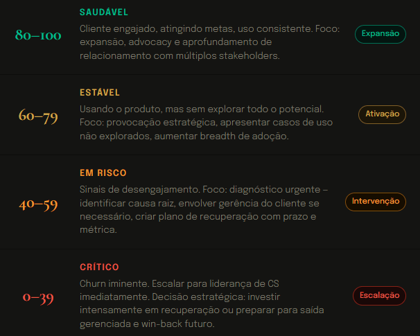 Um health score só funciona operacionalmente se cada faixa estiver associada a um comportamento claro do time. Não uma sugestão – um protocolo. Veja como estruturar: