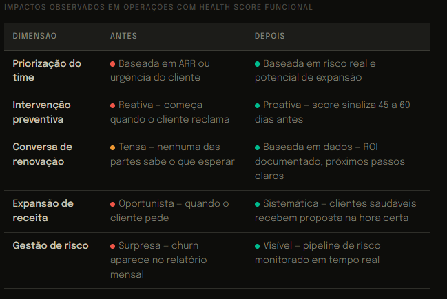 Quando um health score está calibrado e o time opera a partir dele com consistência, três coisas mudam na prática:
